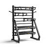 Отличное решение для хранения широкого спектра аксессуаров позволит держать всё необходимое для функционального тренинга под рукой. Две полки увеличенного размера с прорезиненной поверхностью предназначены для надёжного размещения тяжёлых предметов внизу, а две верхние полки — для более лёгких и объёмных аксессуаров. Легкодоступная верхняя полка предназначена для фитнес-мячей, ковриков для йоги и пенных роллеров. Расположенные под углом колышки позволяют разместить все эспандеры, подвесные петли и канаты в одном месте. На нашей станции расположены плакаты-подсказки, которые подскажут, где какой аксессуар должен