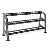 BRONZE GYM BR-1027 - коммерческая стойка для гантелей. Каркас оборудования выполнен из профиля 50*100 мм полукруглого сечения толщиной 2,5 мм. Имеет 30 секций для размещения гантелей. Размер стойки 248*77*117 см.