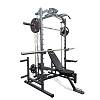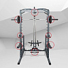 В станции есть тяга верхнего и нижнего блоков. Также машина Смита. Штанга Смита легко скользит по 8 роликам, приводимым в движение встроенными подшипниками, что создает ощущения тренировки со свободным весом.