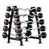 Стойка для изогнутых штанг UFC при довольно компактных размерах имеет мощную стальную конструкцию. Занимаемая площадь стойки для штанг: 83 x 78 см. Для дополнительной защиты применено порошковое напыление черного матового цвета по всей поверхности стойки. Для удобства выполнена маркировка веса.
