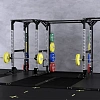Олимпийская рама представляет собой открытую конструкцию с широким проходом, обеспечивающую полную свободу движений при выполнении базовых силовых упражнений со штангой. Устройство сочетает в себе функциональность силовой стойки и удобство системы хранения, позволяя организовать профессиональную зону для приседаний, жимов и тяг на минимальной площади.