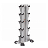 Вертикальный дизайн для компактного хранения 5 пар обрезиненных гантелей – подойдет даже для небольших помещений